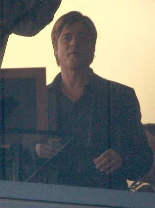 [Brad Pitt, beardless, feels the cool air gently caress his bare chin while filming his new movie Moneyball. Pic via Flynet.]