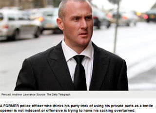 For those of you who haven't seen Puppetry of the Penis [NSFW] in one of its many trips to the U.S. over the past decade, it consists of men engaging in "genital origami," wherein they wind their private parts up into various and assorted shapes. Actually, this seems like a perfect fit for Lawrance, who could lose his job as a police officer for attaching a bottle opener to his penis piercing and opening a beer in front of a crowd of onlookers at a department Christmas party.