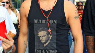 [Gossip Girl actor Ed Westwick strolls New York with a Marlon Brando tank top, red beaded rosary, aviator sunglasses, and a perplexed look on his face. Image via Splash.]