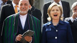 [Flawless Secretary of State Hillary Clinton yuks it up with Afghan President Hamid Karzai while posing for a picture in Kabul today. Image via AP]