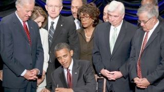 [Democratic leaders hover over President Obama as he signs the Dodd-Frank financial regulatory reform bill into law today. Neither Chris Dodd nor Barney Frank interrupted with an "Oh shit I forgot something," so, phew. Image via Getty.]