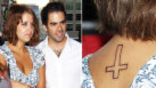 [The golden couple of embarrassing internet use and odd tattoos, Eli Roth and Peaches Geldof, show off Peaches' new tattoos—including the abbreviation for "Fuck My Life"—at Comic Con. Images via Pacific Coast News and @peaches_g.]