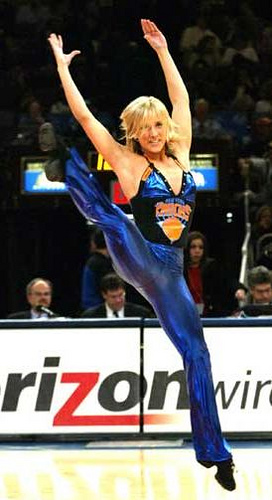 And she's now in upper management, as the the entertainment manager for the across-the-river New Jersey Nets ("she oversees the rehearsals and on-court performances of more than 70 dancers, gymnasts and other entertainers.")