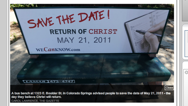 An unemployed woman in Colorado Springs spent $1,200 on 10 bus bench ads heralding Christ's return on May 21, 2011. "There are things... I always wanted to do," she said. "But it's not about what I want." [Gazette]