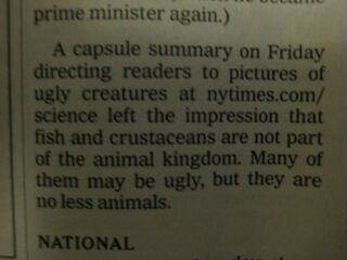A capsule summary on Friday directing readers to pictures of ugly creatures at nytimes.com/science left the impression that fish and crustaceans are not part of the animal kingdom. Many of them may be ugly, but they are no less animals.