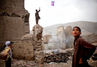 [A boy in Kabul, Afghanistan flies a kite from the top of a ruined building while celebrating the Muslim holy month of Ramadan. Image via Getty]