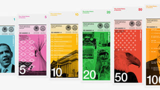 Besides Obama's face, the Dowling Duncan bills are graced with a teepee, the Bill of Rights in full, "20th-century America," a bald eagle, and Franklin D. Roosevelt, complete with a timeline of his legendary first 100 days. As the denominations grow larger, the size of the bills grows too, making them easier to distinguish; the bold colors serve the same purpose. Unlike our bills, these are oriented vertically: