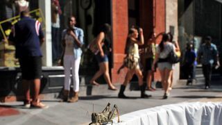[This grasshopper was just out shopping today with the rest of the people in SoHo. All he found was something trashy. Image via AP]