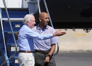 [Jimmy Carter lands in Boston with Aijalon Gomes, the American citizen whose prison release Carter secured from North Korea. Now, American citizens: let's stop wandering across the North Korean border, okay? We're running out of ex-presidents. Image via Getty.]
