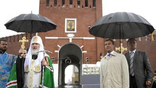 [A shifty-eyed Russian President Dmitry Medvedev and Russian Orthodox Patriarch Kirill keep dry during a blessing ceremony in Moscow today. Image via AP]