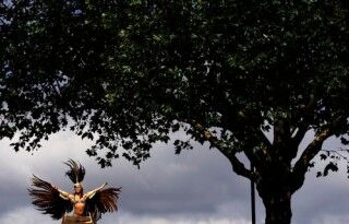 [A costumed reveller performs in the Notting Hill Carnival in London, the largest festival of its kind in Europe. Pic via AP.]