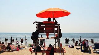 [A lifeguard hides from the hot sun under his brightly-colored umbrella on the beach at Coney Island today. Image via Getty]