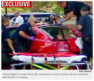 On Tuesday morning, the 22-year-old Magill jumped feet first from the high-rise on West End Ave, but his suicide attempt was thwarted by a red Dodge Charger, which somehow broke his fall from 400 feet. Magill is recovering after having metal rods inserted into his legs, along with other operations. But for Maria McCormack, whose husband Guy was borrowing her 2008 Charger that day, this situation is far from over. She spoke to the Post and she wants some answers from this sissy who tried to kill himself on her car: