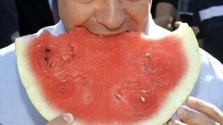 [Russian President Dmitry Medvedev bites a watermelon while visiting a farm 450 miles southeast of Moscow. Wuss! Putin would have impregnated it, and then shot it. Pic via AP.]