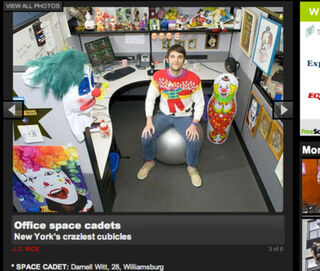 28-year-old Williamsburg resident Darnell Witt is Associated Content's senior community manager, responsible for herding the thousands of low-paid freelancers who write AC's stuff. According to the New York Post, he's also a bit strange. Witt has plastered his cubicle with clown-themed paraphernalia, including jars of clown heads and masks. (Also, he uses a yoga ball for a chair and has doll heads tacked to the wall!)