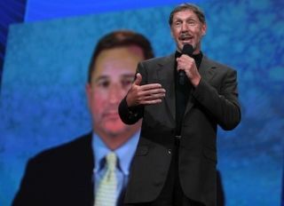 Hurd's hiring would also indicate that Oracle CEO Larry Ellison—a guy who desperately wants to be thought of as (and to some extent is) a fabulously wealthy jet-setting playboy type—wasn't concerned with Phillips' starring role in the extramarital advertising campaign. It's likely that public missteps like Phillips' claim that Oracle would "spend $70 billion in acquisitions over the next five years" (which the company quickly quashed) played a bigger role in his departure—though both Ellison (pictured, in 2008, standing in front of Hurd's face on a screen) and Phillips have indicated that Phillips has been looking to leave since at least 2009.