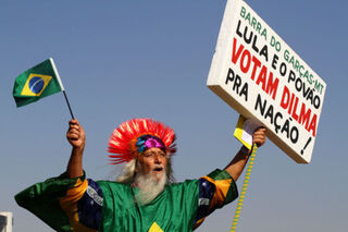 [Tuesday was Brazil's Independence Day! Happy Independence Day, Brazil! This guy—a supporter of Workers Party candidate Dilma Rousseff—brought a sign to the parade. It says: "Lula and the people vote for Dilma for the nation." Pic via AP.]