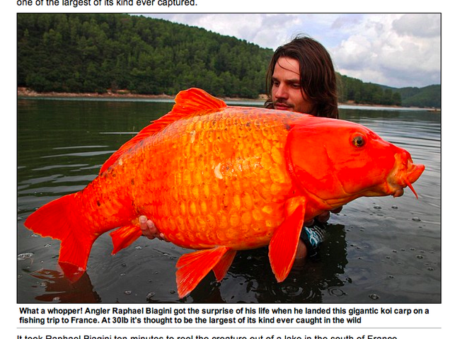 Fisherman Raphael Biagini recently caught a 30-pound goldfish in the south of France. It weighs "the same as an average three-year-old girl" and looks about the size of a big dog. Now, he can sell it to a giant!