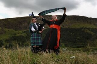 [Scotland created a special tartan (plaid pattern) to commemorate the Pope's visit! Here, Cardinal Keith Patrick O'Brien and piper Louise Marshall Millington unveil the thing. Plans to specially deep-fry a Mars bar were scrapped. Pics via Getty. Click for close-ups.]
