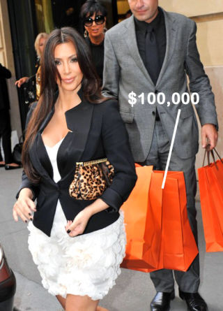 - Kim Kardashian went on a $100,000 purse shopping spree in Paris. For the price of 40 acres in Musselshell County, Montana, Kim bought seven items to hang in the crook of her arm: Six $10K Hermes Birkin bags, and one $30K bag made from "an extremely rare crocodile skin." (Andre Leon Talley?) So that's $90K in purses, plus fancy French tax, equals $100K, TMZ estimates. [TMZ, image of Kim exiting the Hermes store via Bauer-Griffin]