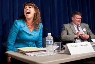 So this crazy lady named Christine O'Donnell defeated an old man in battle and now she is queen of Delaware. This made Karl Rove very sad. And no one likes Karl Rove to feel sad! Even Sarah Palin, the bloody war god in whose honor Christine O'Donnell makes sacrifices, told him to cheer up. Then everyone went home and, no they didn't hug gay people they know, they actually just masturbated all over each other, like Jesus would want.