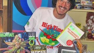 The morning after Jacob told us about his dream to appear in stoner bible High Times, the kings of cannabis called Jacob and sent him a glorious spread of High Times merchandise. The above picture shows him posing with his bounty at his favorite Amarillo, Texas head shop. High Times recounts Jacob's harrowing story: