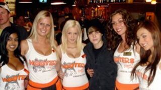 During a recent stop in Edmonton, Canada, Justin Bieber stopped by a Hooters at the West Edmonton Mall. Here is a picture of Beiber posing with women whose boobs are the size of his head.