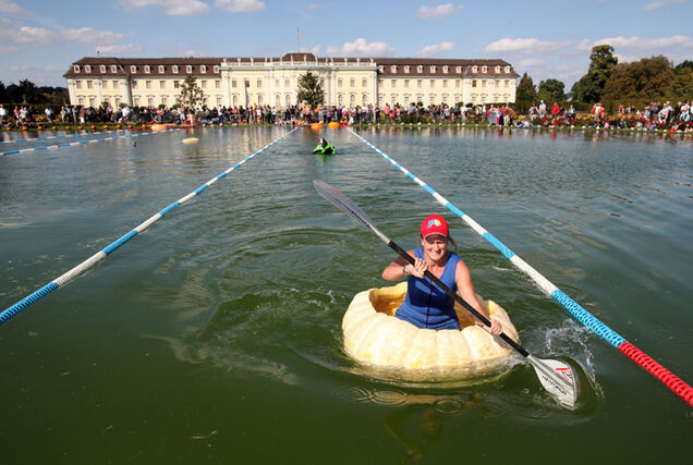 [A woman races across a lake at Ludwigsburg Castle in a hollowed out pumpkin during the Ludwigsburg Pumpkin Festival in Germany today. Image via Getty]