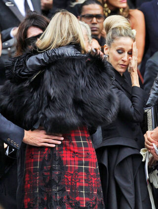 [Sarah Jessica Parker fails to shield her eyes from all the atrocious outfits at the memorial for fashion designer Alexander McQueen in London today. Image via Splash]