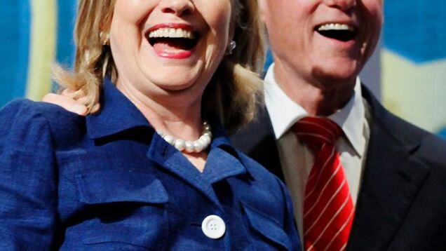 [It was a laugh a minute as Secretary of State Hillary Clinton and husband Bill attended the Clinton Global Initiative meeting in New York today. Image via AP]
