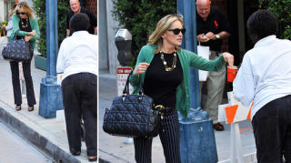 [Sharon Stone generously spared $5 for a homeless person yesterday outside Mr. Chow Restaurant in Beverly Hills under the watchful eye of her publicist, Paul Bloch. Photos via Splash News]