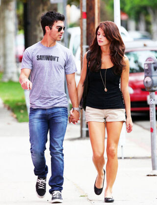 [Strolling with actress girlfriend Ashley Greene, Joe Jonas sends a message with his t-shirt. Joe quit wearing his chastity ring earlier this year. Image via Pacific Coast News.]