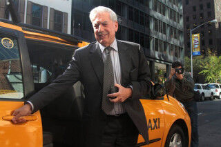 [Peruvian author Mario Vargas Llosa gets out of a cab in New York today after being named the recipient of this year's Nobel Prize in literature. Image via AP]