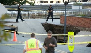 A 50-foot sinkhole opened up on the street in Hoboken, NJ yesterday afternoon. According to Gothamist, no one was injured. Well, there's finally a reason to visit Hoboken, NJ! [Image via AP]