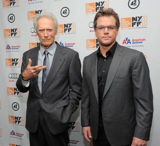 [Actor Matt Damon and director Clint Eastwood are bummed to see you at the premiere of their new movie The Hereafter. Photo via Getty.]