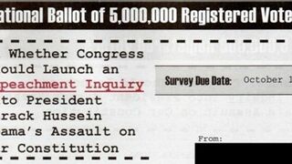 The flyer, obtained by TPMMuckraker, includes a "national ballot of 5,000,000 registered voters" on "Whether Congress Should Launch An Impeachment Inquiry Into President Barack Hussein Obama's Assault On Our Constitution."