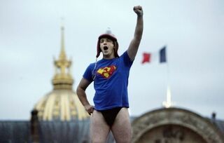 [This uniquely attired student was one of the estimated 1 million people who took to the streets across France today to protest the government's plan to raise the retirement age from 60 to 62. A racy protest sign inside.]