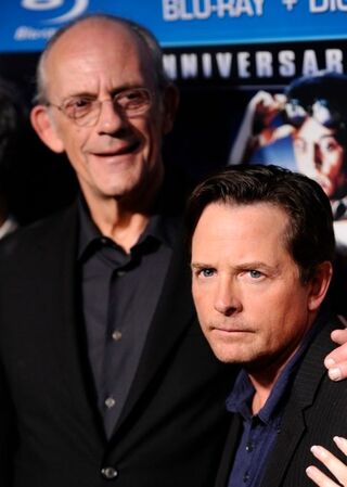 [Monday was the 25th anniversary of Doc Brown being gunned down by Libyan terrorists in Back to the Future, and the cast—including actors Christopher Lloyd and Michael J. Fox—had a little reunion. Photo via AP.]