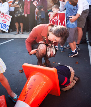 [A liberal tot tries to hide from Republican Senate candidate Carly Fiorina outside a GOP phone bank in California today. Image via Getty]