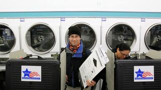 [Chicago voters arrive at an unconventional polling station located in a laundromat today. No word on if they elected darks or whites. Image via AP]