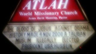 The link goes to this Twitter user's picture of a sign outside the church of Pastor James David Manning, who once called Barack Obama a "pimp" and "long-legged mack daddy" in a sermon. [@SarahPalin via Palingates]
