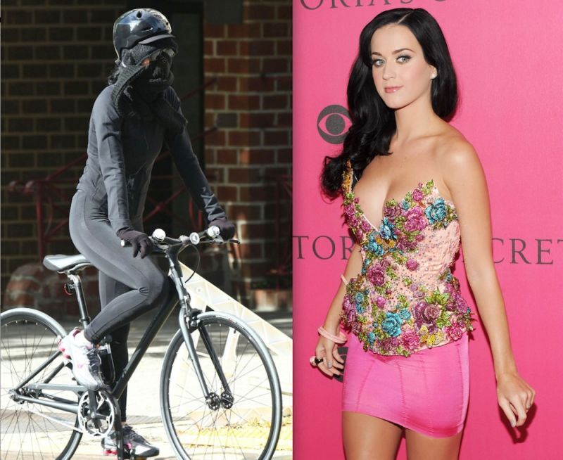 Today Katy Perry bundled up on her bike like some Star Wars character, concealing every inch of skin to escape the paparazzi. (She failed, of course.) Just hours later, her barely-covered performance thrilled a Victoria's Secret show. Symbolism?