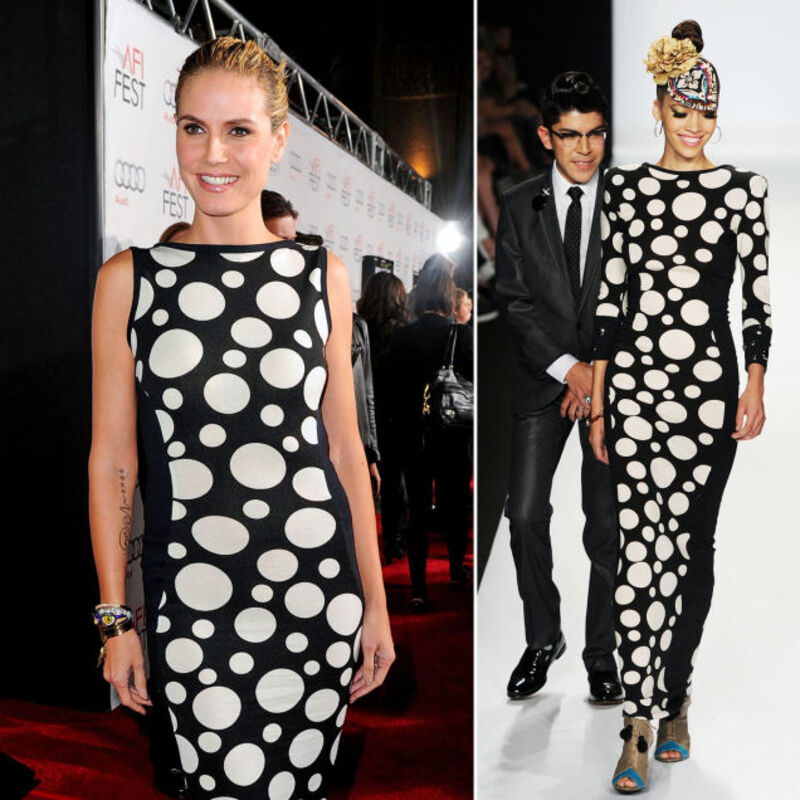 Heidi Klum attended the Black Swan premiere in the signature dress from Project Runway runner-up Mondo Guerra's collection. When Heidi defended the dress on the show, fellow judge Nina Garcia snorted, "I'd like to see you wear that dress, Klum."