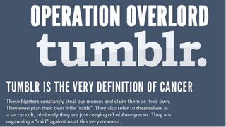 Tumblr users are freaking out about today's attack, the culmination of a campaign, "Operation Overlord," launched by 4chan to pay back Tumblr for encroaching on their turf. That turf being making dumb jokes and harassing strangers on the Internet. If you see 13-year-old girls running from their homes weeping at 5pm today, Operation Overlord is why.