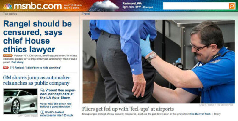 Silver lining to TSA's new crotch-groping policy: voyeurs have so much to look at! Check out this splashy photo display, showing a latex-gloved TSA agent squatting (on his knees?) with his arm submerged between another man's legs.