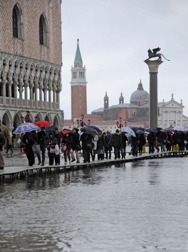 [High tides in Venice forced the city to place raised sidewalks across St. Mark's Square. Photo via AP.]