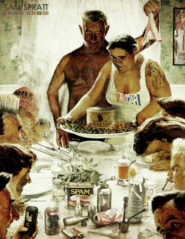 [Illustration by Contributing Illustrator Sam Spratt, based on Norman Rockwell's "Thanksgiving." Check out Sam's newly redesigned portfolio website and become a fan of his Facebook Artist's Page.]