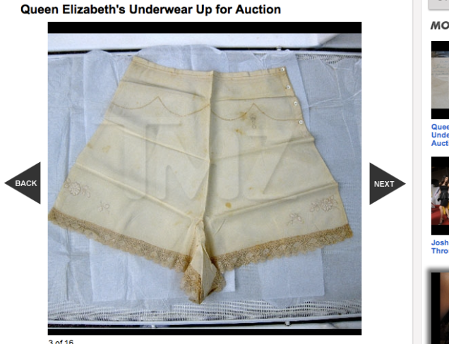 Still looking for that perfect Christmas gift? Stop looking, because I just found it for you: A pair of underwear that supposedly belonged to Queen Elizabeth is being auctioned off. It should go for "around $9,000." [TMZ]