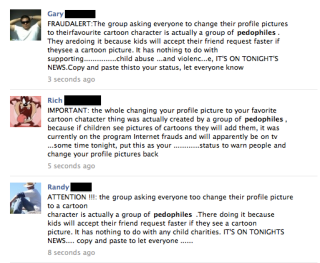 ATTN:The group asking everyone to change their profile pictures to their favorite cartoon character is actually a group of pedophiles . They are doing it because kids will accept their friend request faster if they see a cartoon picture. It has nothing to do with supporting child abuse and violence, IT'S ON TONIGHT'S NEWS. Copy and paste this to your status, let everyone know now !!!