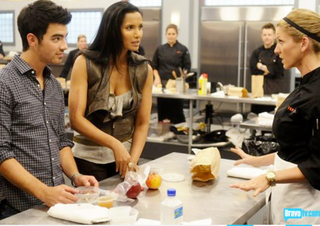 Cook, cook, cook; boring, boring, boring and then the Quickfire is over. On the bottom is Joe Jonas—oh, sorry, that was my overactive imagination getting the best of me. On the bottom was Black Tiffani's coconut white pudding thing, Mike's chocolate polenta bars (really, kids would rather eat chocolate flavored dirt), and Steven's Snickerdoodle Sandwich, which sounds enough like one of those dirty sexual positions to be moderately amusing. Jen's bacon and ginger flavored taffy—which looked like a bunch of tissues crumpled on my floor after watching a Jonas Brothers video—looked like the most disgusting concoction I have ever seen, and I have no idea how it didn't get called out for grossness. Angelo's snack was called "Cheese Crisps 2010: The New Evolution." Isn't that the name of the new Britney Spears tour or some shit? Who gives their dish such an obnoxiously robotic colonated name? You're not Wall Street 2: Money Never Sleeps, Angelo.
